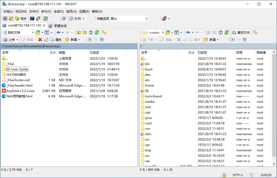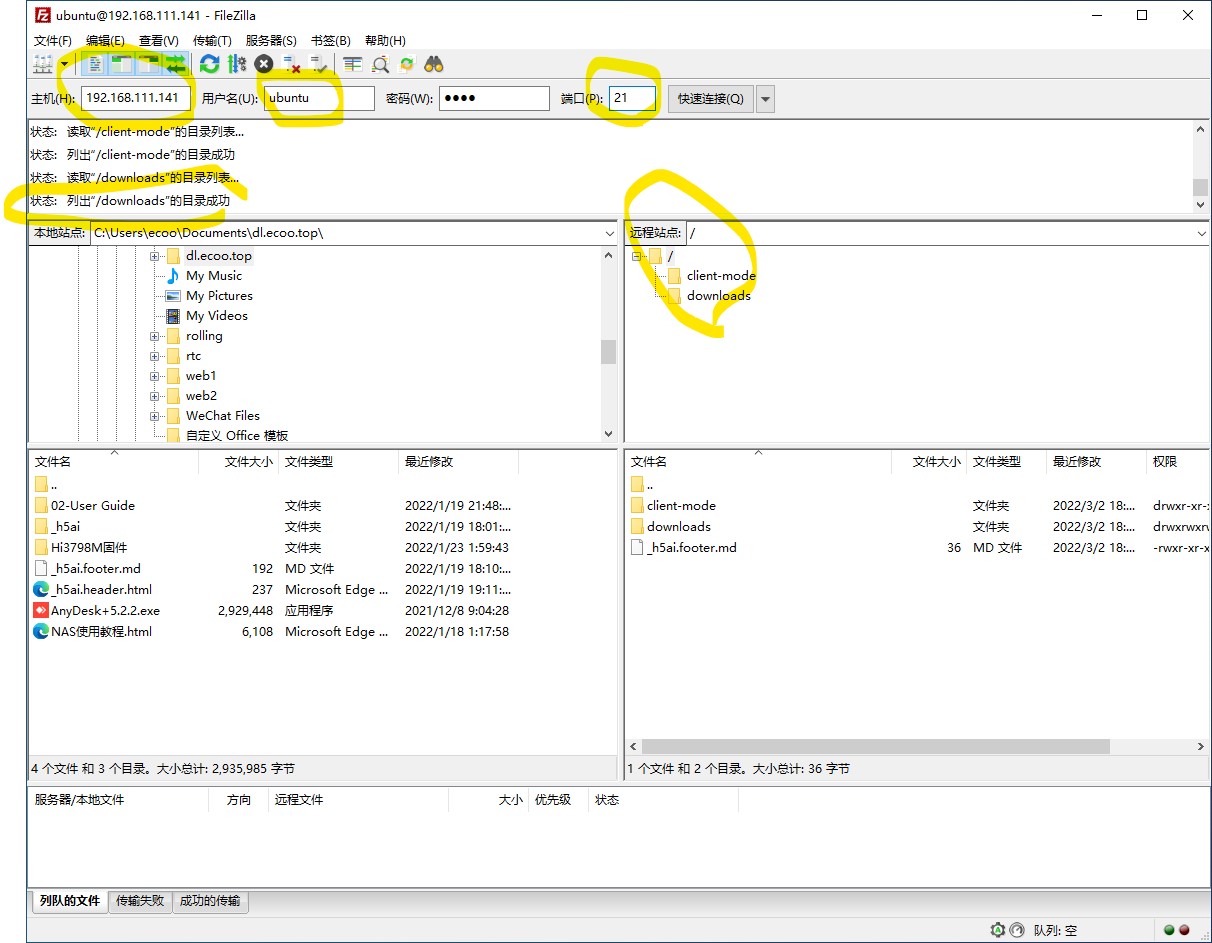NAS 系统已内置了 vsftpd 服务端, 可以使用 FTP 上传或下载软件, 同时也可以进行系统文件管理 初始用户名 ubuntu, 密码与系统一致 建议使用filezilla或者winscp进行文件传输管理